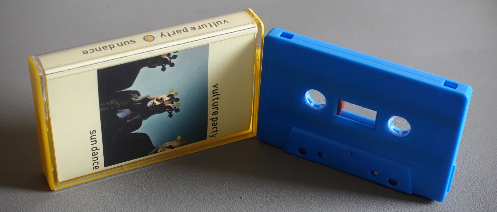 As it turns out, releasing music on cassette is quite common these days and even Scottish bands do it. Not just lo-fi limited appeal bands either but also bands with enough in the way of poise and intellectual intent to pull people away from the land of the download. The next, self-released this time, cassette on the list is therefore “Sun Dance” by Falkirk band Vulture Party and, this time, the cassette is blue and the case is yellow. I like colours.